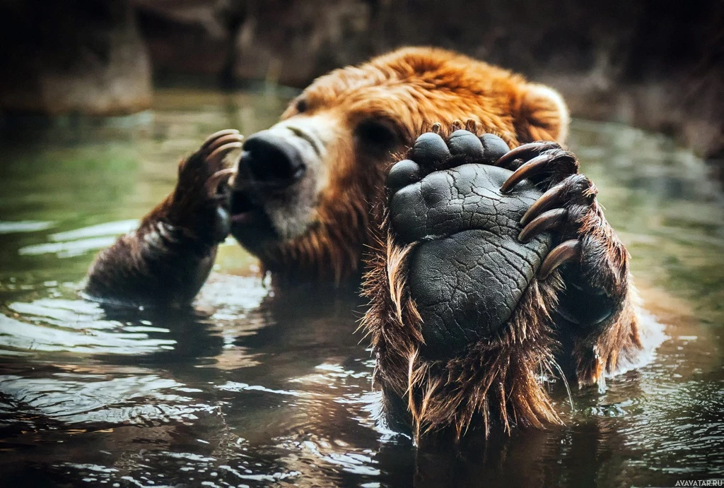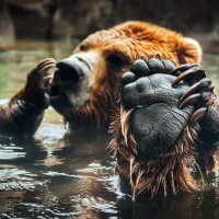 The image shows a bear with its paws raised, seemingly out of the water. It appears to be playing or interacting in