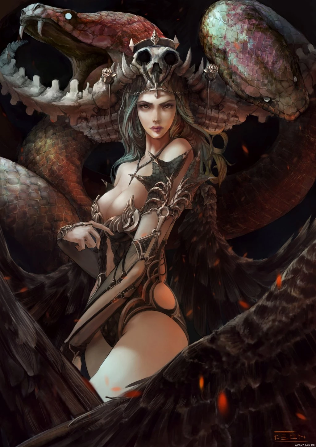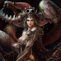 a humanoid form but has attributes of snakes or serpents. Her upper body resembles that of a human, but she has scales like those of a snake covering her torso, arms, and lower legs. Additionally, she wears a headdress that seems to be made from the skulls of animals, possibly snakes given their