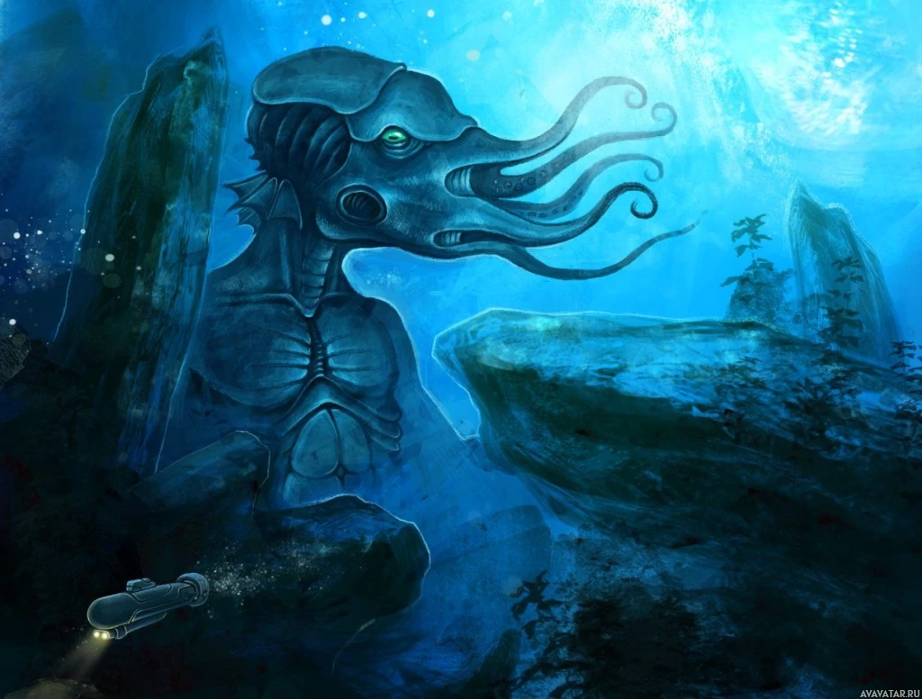 a fantasy creature that resembles Cthulhu, an entity from the works of horror fiction author H.P. Lovecraft. The creature is shown in an underwater environment with various