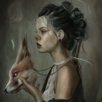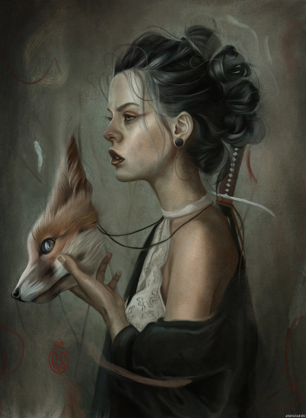 a distinctive look, possibly wearing makeup that accentuates her eyes and highlights her facial features. Her clothing is elaborate, suggesting a setting that could be related to historical or fantasy themes. In her hand, she holds what appears to be a fox's head, which is turned toward the viewer. The art style has elements of realism with some stylized components, and there are symbols and text in the background that add to the mysterious and intriguing atmosphere of the image.