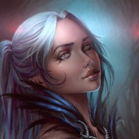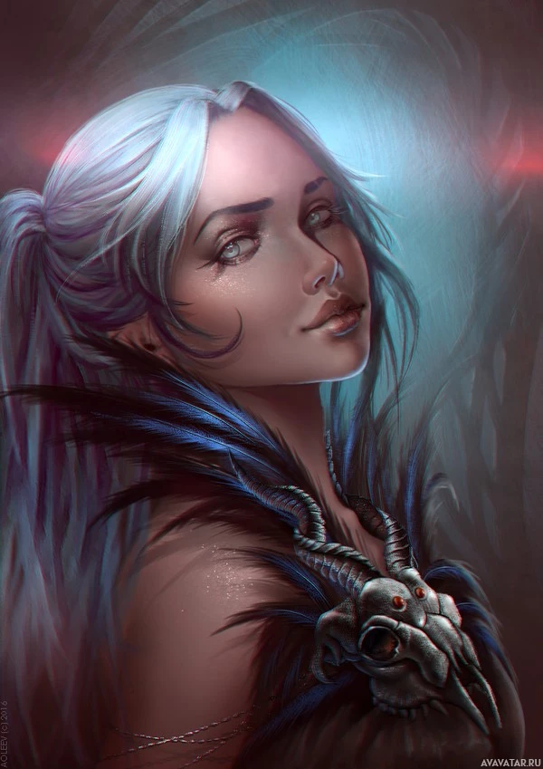 blonde hair, blue eyes, and is wearing what appears to be elven or fantasy-style clothing with feathered elements. There's an ornate necklace around her neck, and she has some sort of glowing emblem on her