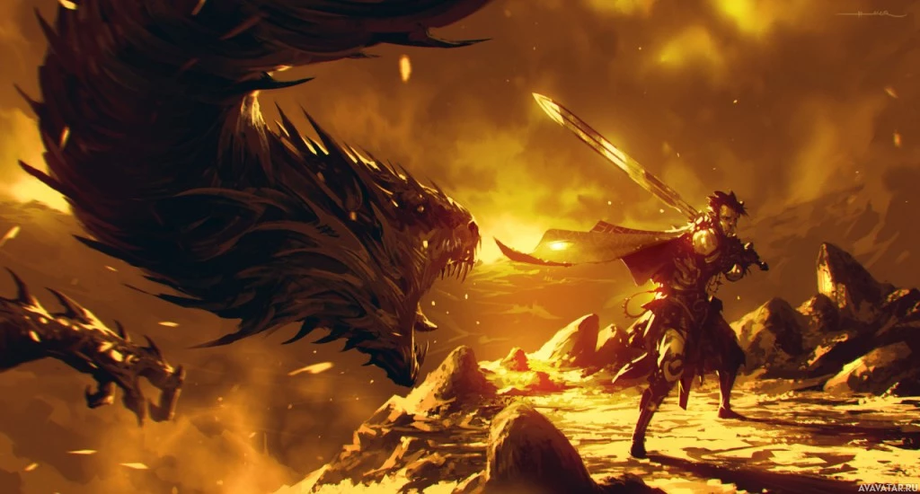 a fiery battleground. The warrior is wielding a sword and is in the act of fighting against the dragon, which has its wings spread wide and seems to be roaring or breathing fire. The overall atmosphere suggests a high-stakes conflict often found in