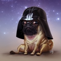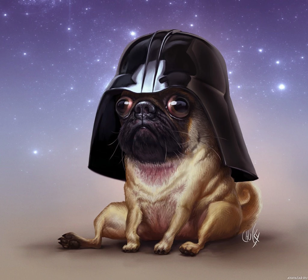 The image features an adorable pug dog sitting upright, wearing a helmet that resembles the iconic headgear of Darth Vader from