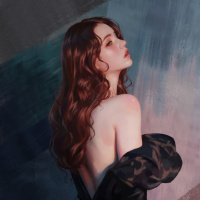 На картинке изображена стилизованная картина женского персонажа. У нее длинные рыжие волосы и она носит то, что кажется черной одеждой с опущенным вырезом, раскрывающим ее плечи. Ее поза предполагает, что она может быть в танцевальной или театральной постановке. Фон имеет размытый эффект, привлекая внимание к центральной фигуре.