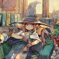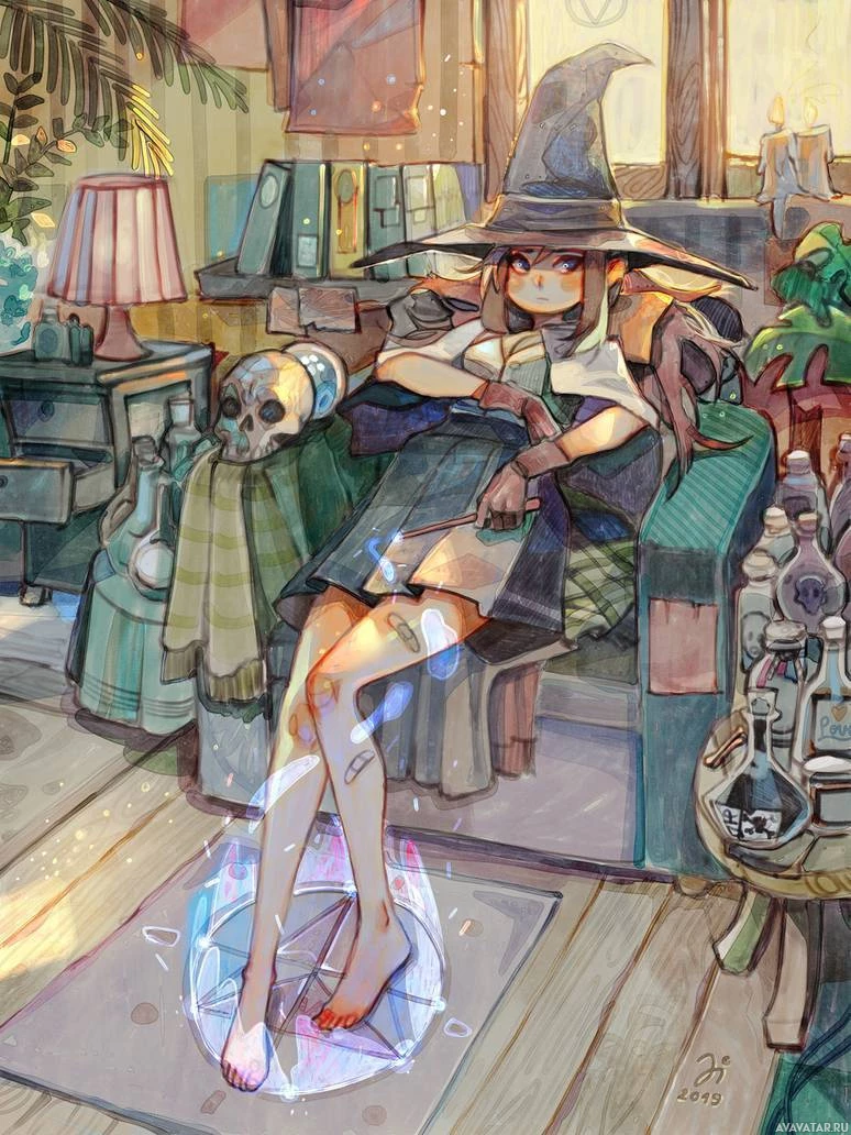 an animated character who appears to be a witch. She is sitting on a couch with her legs crossed and wearing a witch's hat, which is a common accessory associated with the stereotypical representation of witches in