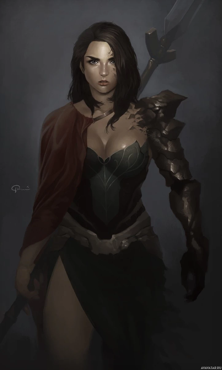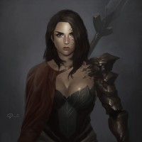 a female character, presumably from a fantasy or video game setting. She has shoulder-length