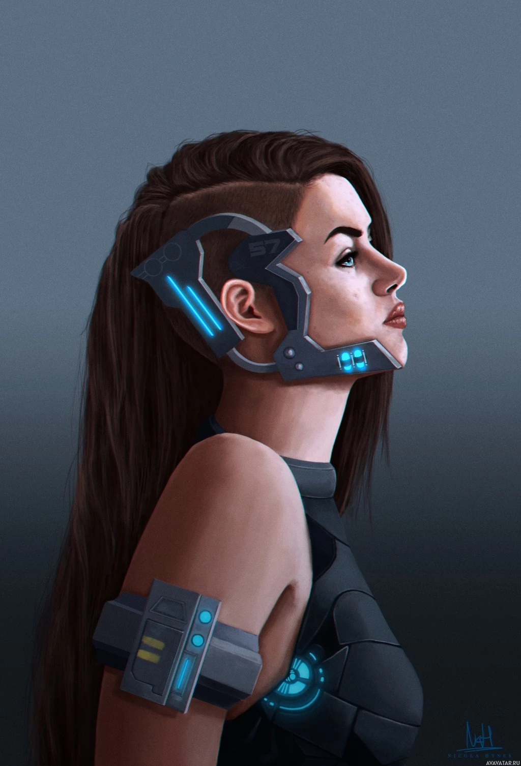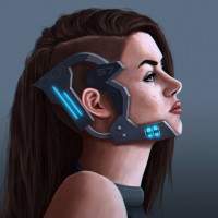 dark hair and what appears to be cybernetic enhancements or a suit that suggests futuristic or science fiction themes. She has