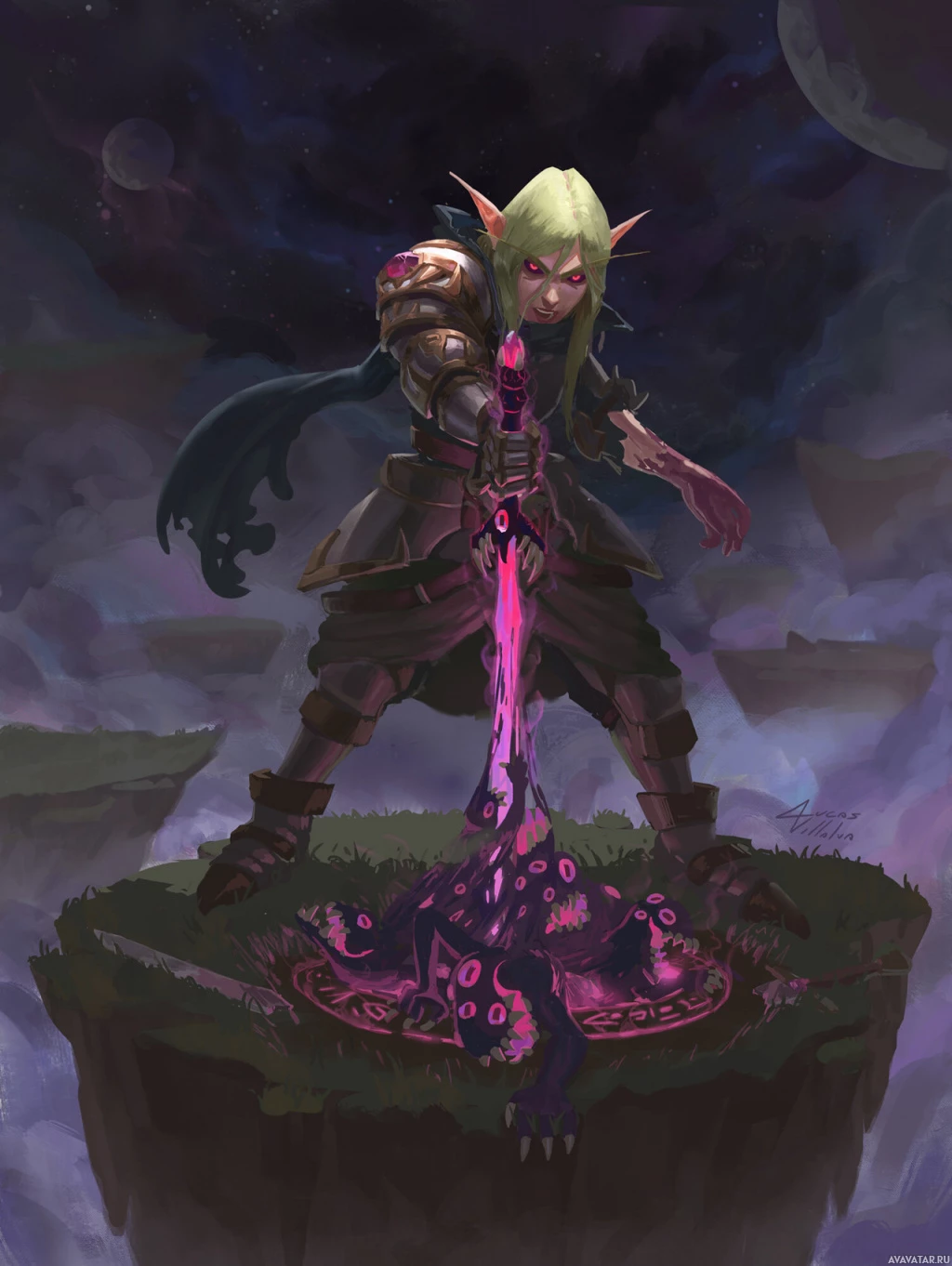 blonde hair and pointy ears. The elf is wearing armor and holding a sword, suggesting they might be a warrior or guardian of some sort. In the foreground, there's a creature that appears to be a pinkish, slimy, multi-eyed monster with tentacles, which could represent