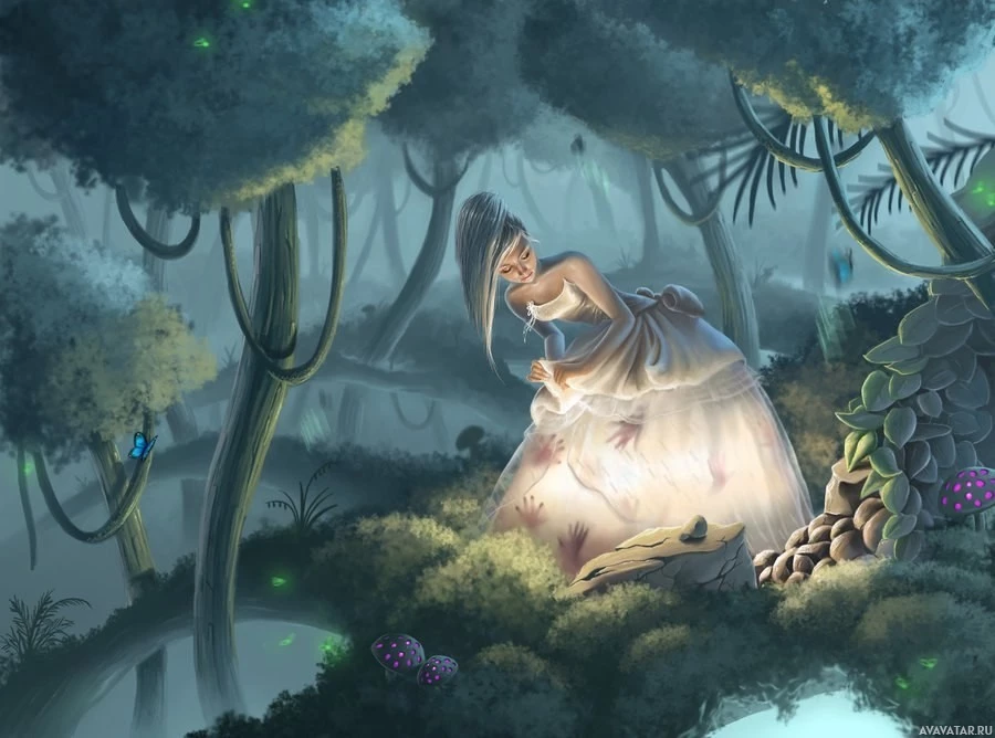 young girl is the central figure, dressed in a formal, elegant gown with flowing skirt and sleeves. She stands beside what appears to be a magical well or spring, with light emanating from it illuminating her face and