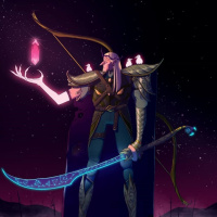 pointed ears, which is characteristic of fantasy depictions of elves. The background is dark, possibly indicating that this scene takes place at night or in a dimly