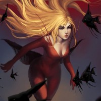 a female character with blonde hair and striking red eyes. She is wearing a costume that resembles that of a superhero, featuring a cape and armor in