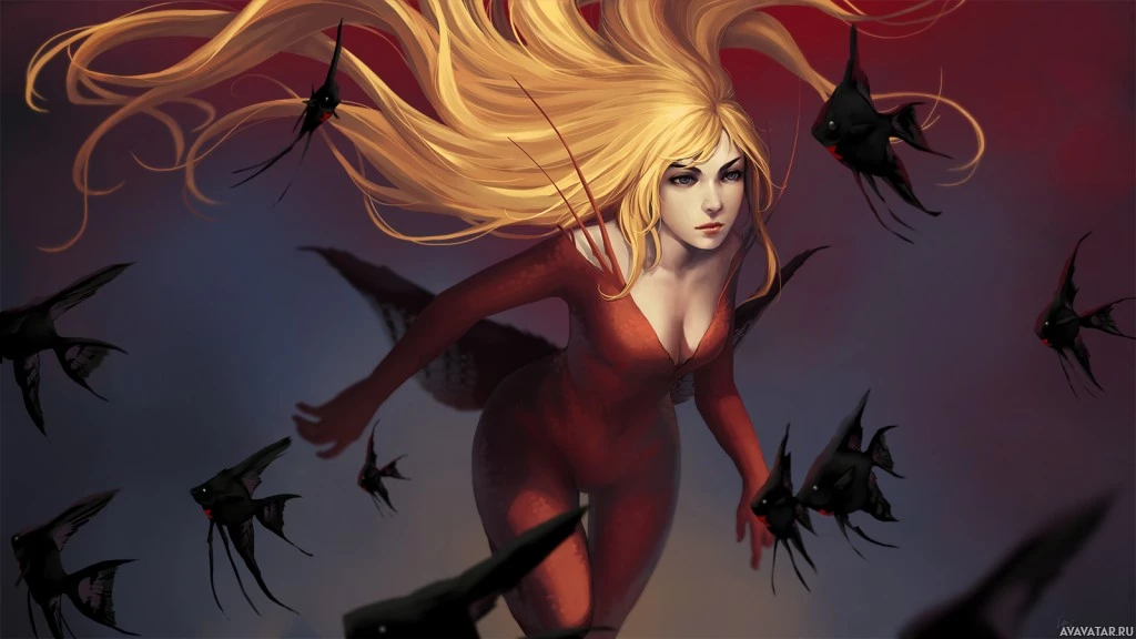 small figures or creatures flying around her, which could be interpreted as fish due to the presence of fins on these figures. The overall atmosphere of the image is dark and moody, with