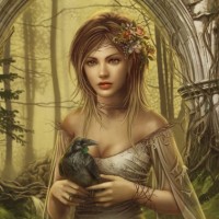 a young woman who appears to be set in a magical or mythical forest. She has