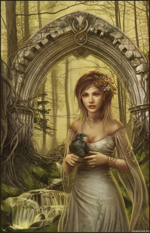 a small bird on one hand and a flower crown on the other. The setting includes an archway made of stones or bones that looks ancient, surrounded by lush vegetation and
