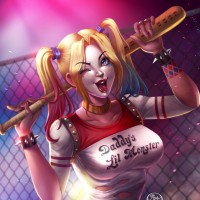 Harley Quinn, a fictional character from the Batman series. She is depicted holding baseball bats and appears to be in