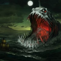 a moonlit sky with dark clouds casting a glow on the sea. A ship is visible in the distance, which might suggest that it could be under threat from the monster. The overall atmosphere of the image conveys