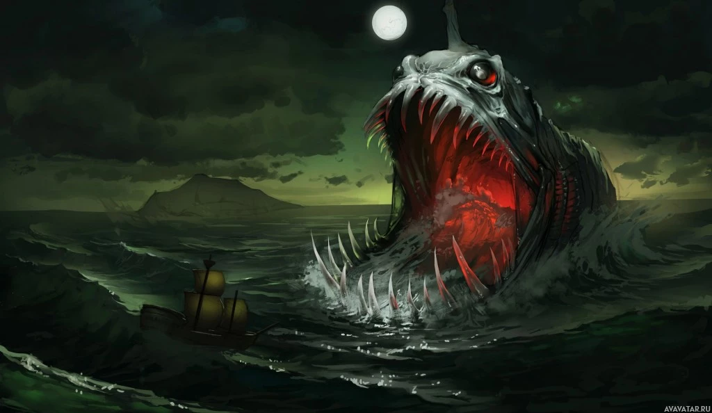 The image depicts a dramatic and ominous scene. There is an enormous, menacing monster looming over the ocean, its mouth open in a frightening display of