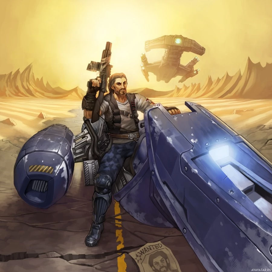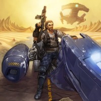 The image shows an illustration of a character sitting on a motorcycle in what appears to be a desert or