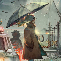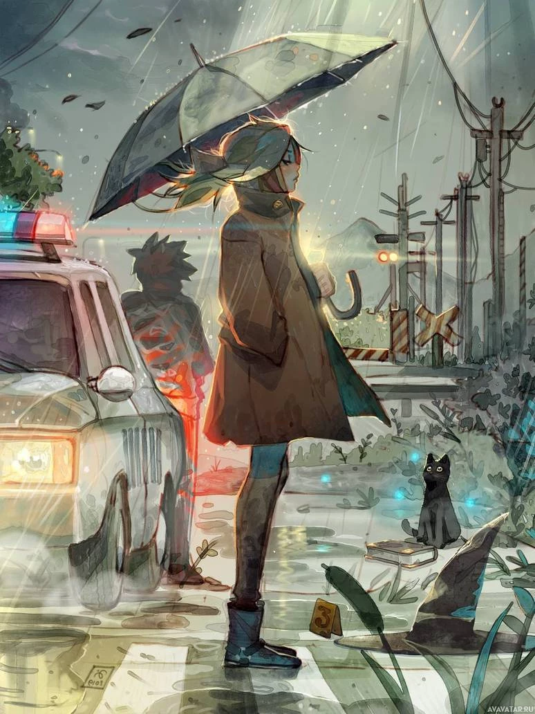 The image depicts a scene of an umbrella-holding girl, who appears to be a blonde, standing on