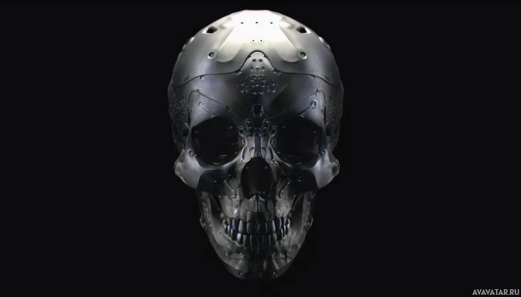 The image shows a skull with a mechanical or robotic appearance. It has intricate detailing that mimics the look of circuitry and gears, suggesting