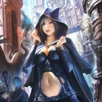 a female character who appears to be from a fantasy or role-playing game setting. She is wearing a black outfit with a hood and has