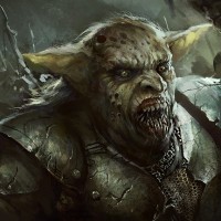 glowing eyes, and a menacing expression. The orc is wearing armor and appears to be engaged in battle or confrontation with other characters that are not fully visible in the image. The background suggests a dark, possibly nighttime environment, enhancing