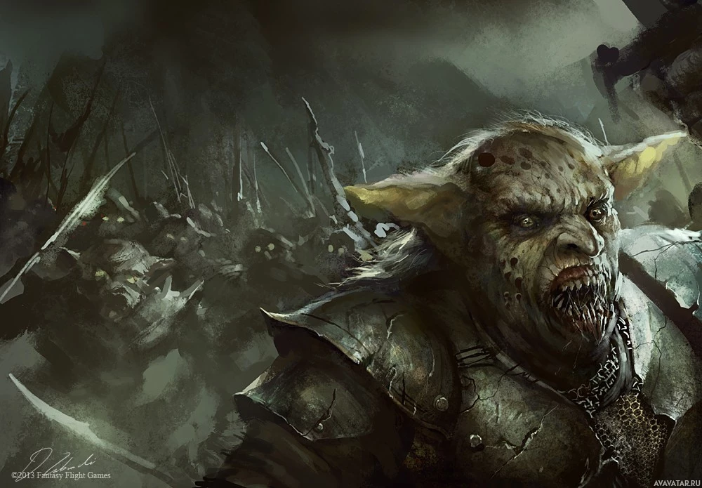 a fantasy scene featuring an orc character. This creature, known for its aggressive and warlike nature in various fantasy settings, is shown with exaggerated features such as sharp teeth,
