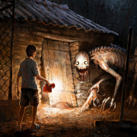 glowing eyes, which is likely meant to represent a horror theme. The setting looks dilapidated, suggesting it might be an abandoned or