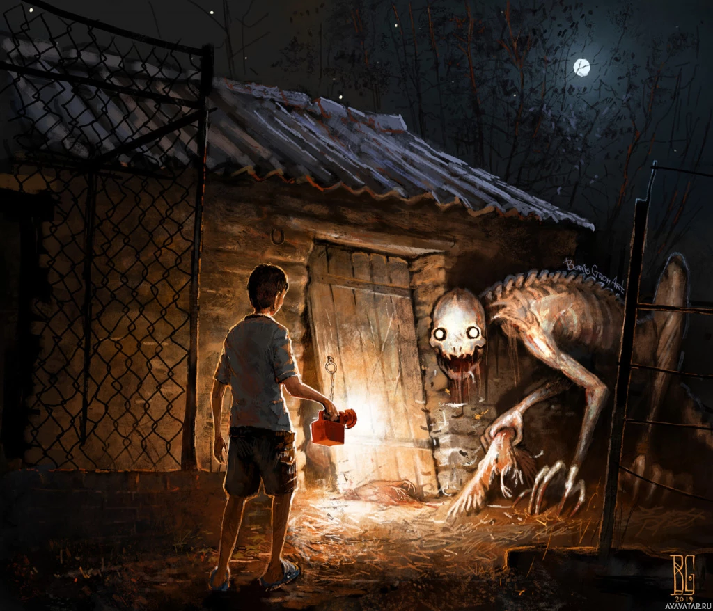 The image depicts a child standing in front of an open doorway that leads to a dark and