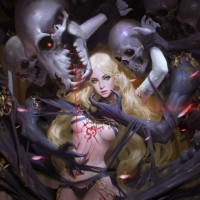 the midst of a battle or confrontation with various skulls and skeletal figures that surround her. Her expression is intense, suggesting she is engaged in combat. The overall atmosphere suggests a dark fantasy theme.