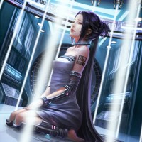 black hair, wearing a dark-colored dress. She is depicted kneeling inside what looks like a futuristic or science