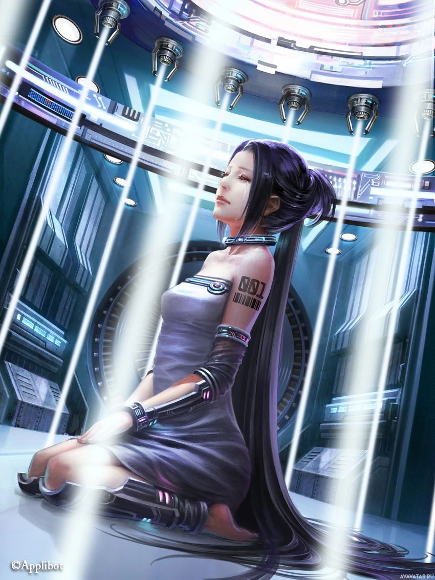 fiction setting. There are high-tech elements around her, including a circular device and screens displaying