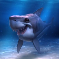 The image shows a digital rendering of a shark swimming underwater. It appears to be an animated or computer-generated image rather than a photograph of