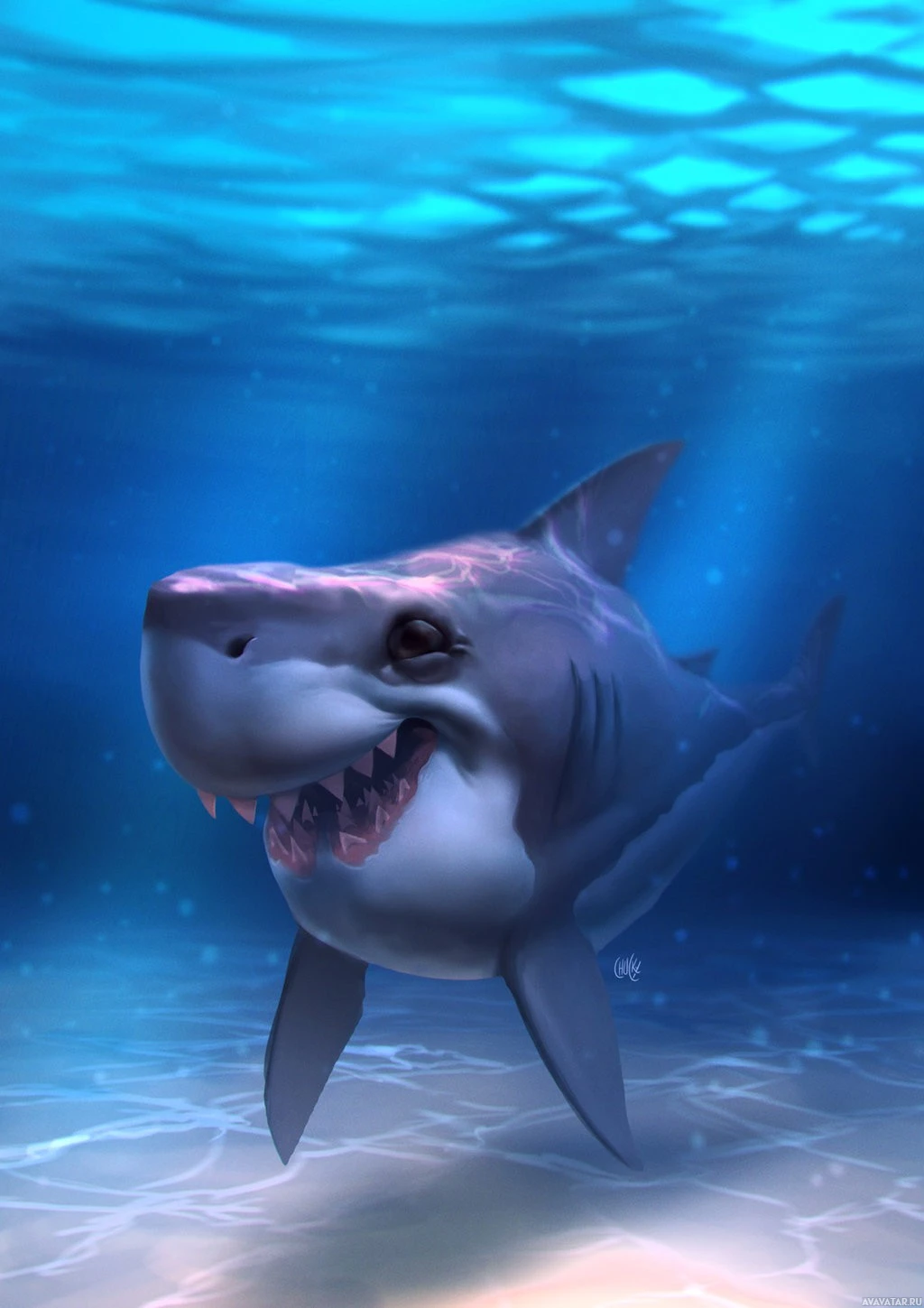 a real animal. The shark is depicted with its mouth open, showing teeth that are typical for sharks. This type of image might be used in various media, such as games, movies, or educational materials about