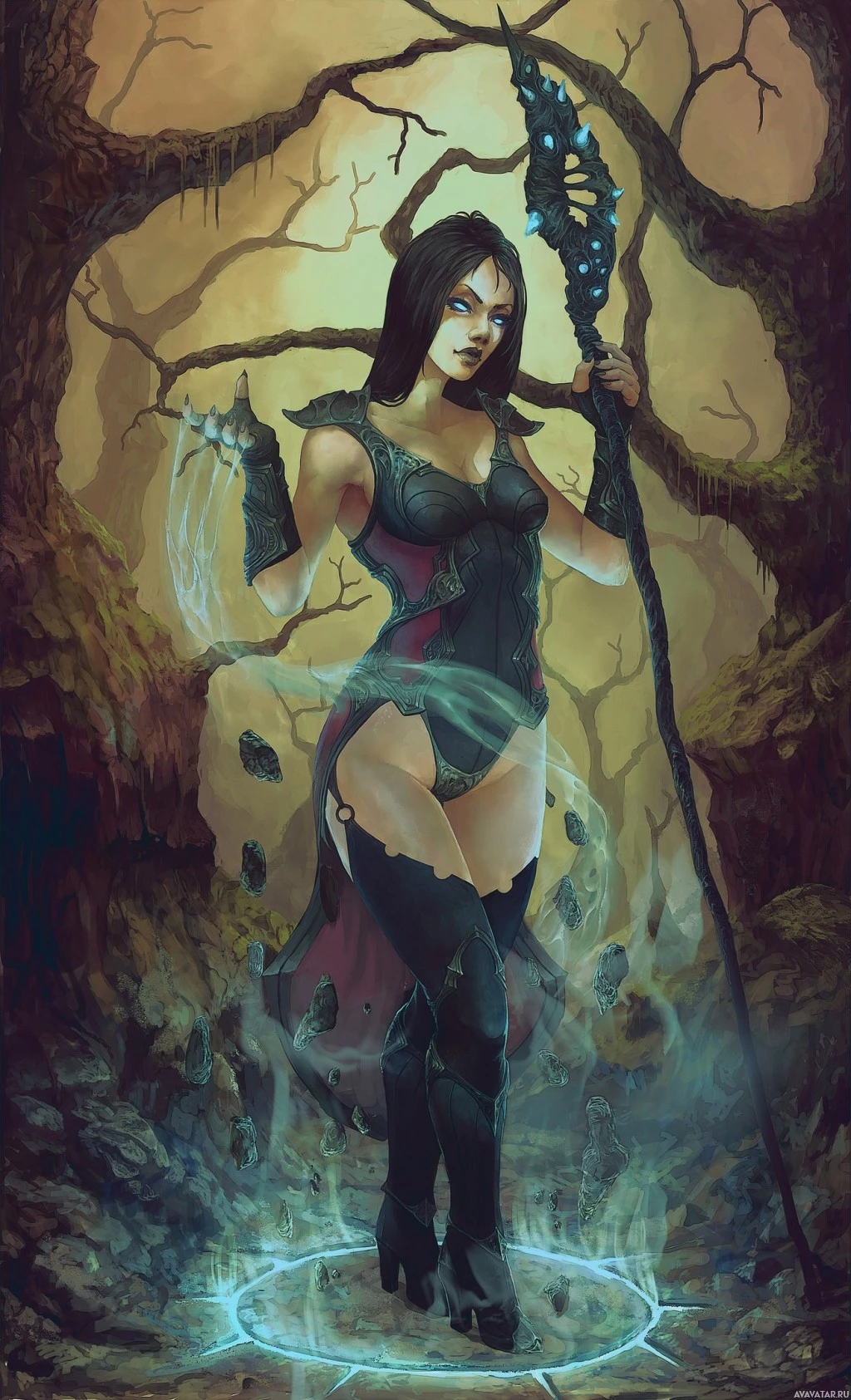 a fantasy setting, possibly a witch or a sorceress due to her magical staff. The background appears to be