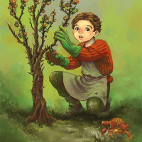 a young boy crouched next to a tree, engaged in picking fruit from its branches. He appears to be wearing gloves and an apron, which suggests that he might be involved in some gardening or orchard-