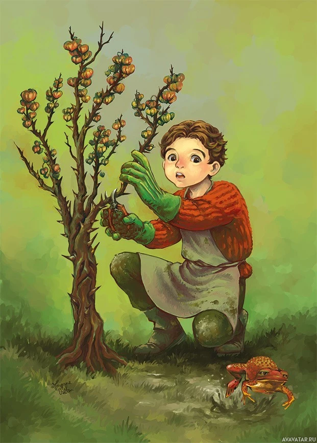 green creature in the foreground that could be interpreted as a toad based on its color and shape. The overall atmosphere of the image is pastoral and whimsical.