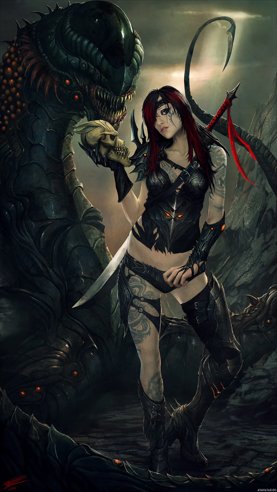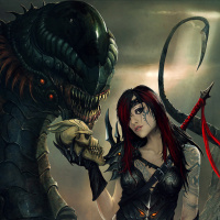 a female character in an illustrated fantasy setting. She appears to be a warrior or adventurer, as suggested by her attire and the skull she is holding. Her outfit includes