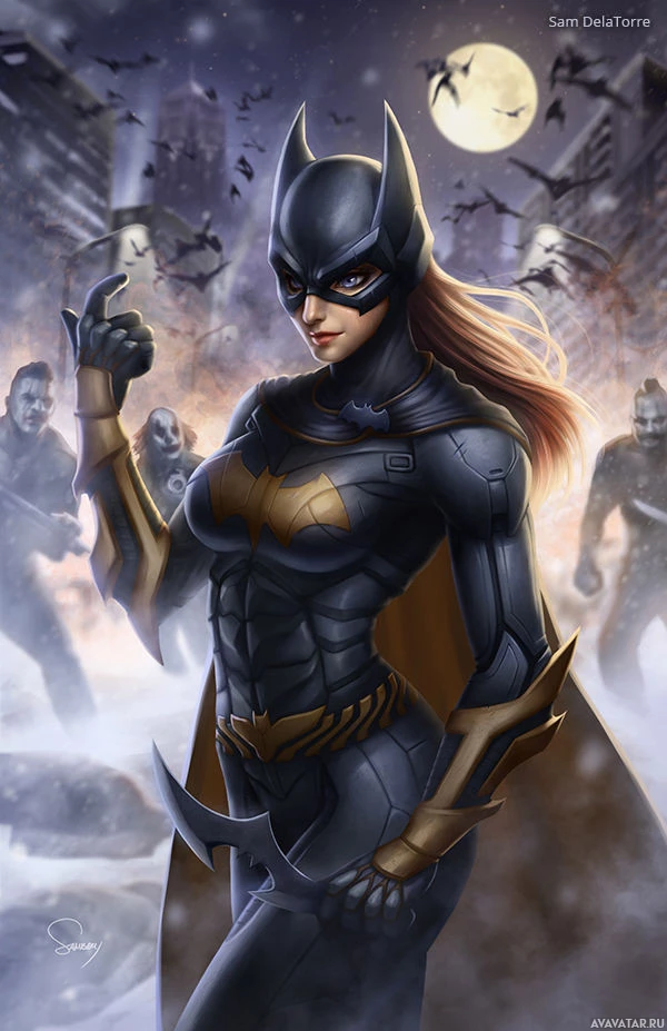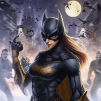 a female character dressed as Batgirl, standing in the foreground. She is pointing towards something or someone not visible in the picture. In the background, there are