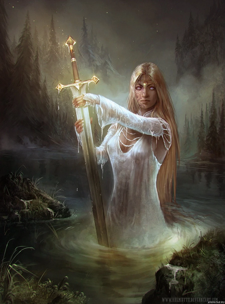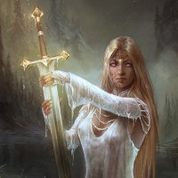В изображении есть девушка, которая, кажется, находится в фантастической обстановке. У нее светлые волосы и она держит меч. Фон предполагает темную и туманную среду, возможно, лес или озеро во время сумерек или рассвета из-за мягкого освещения. Ее выражение и поза передают чувство решимости или готовности к бою.