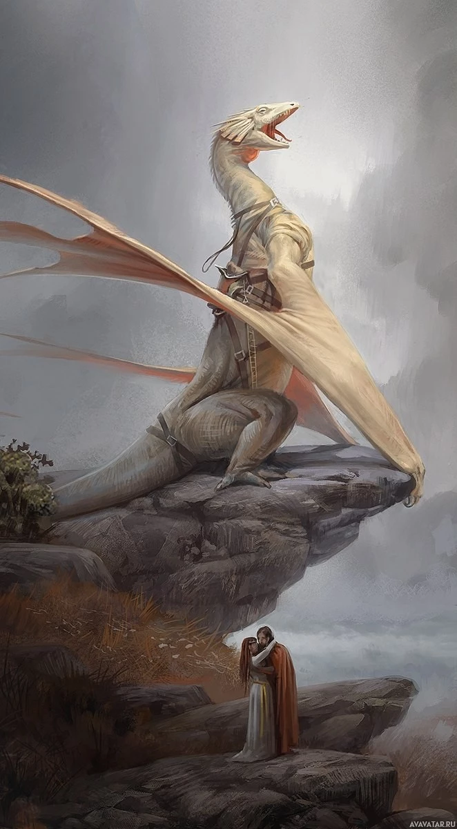 This is an image of a fantasy artwork depicting a dragon and a human. The dragon, which has a humanoid form with the head of a bird-like creature, sits atop a rocky outcropping overlooking what appears to be a landscape or