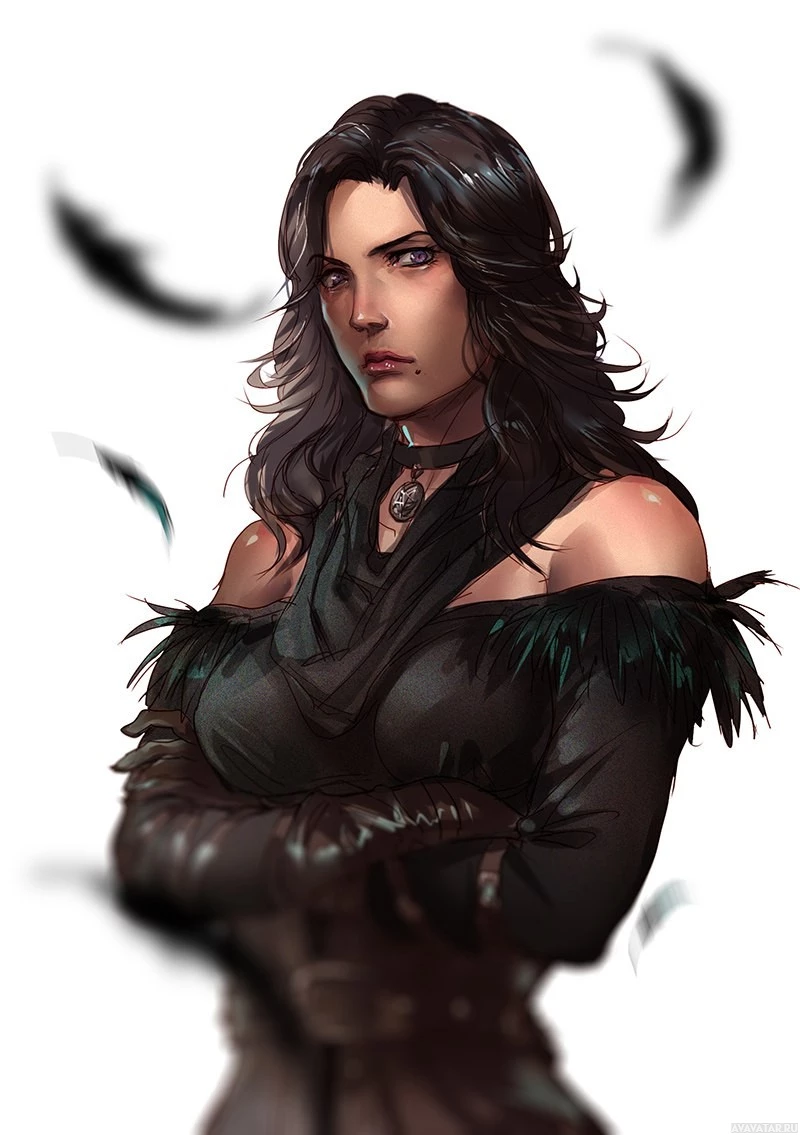 the video game "The Witcher 3: Wild Hunt." She is depicted in her typical appearance which includes black