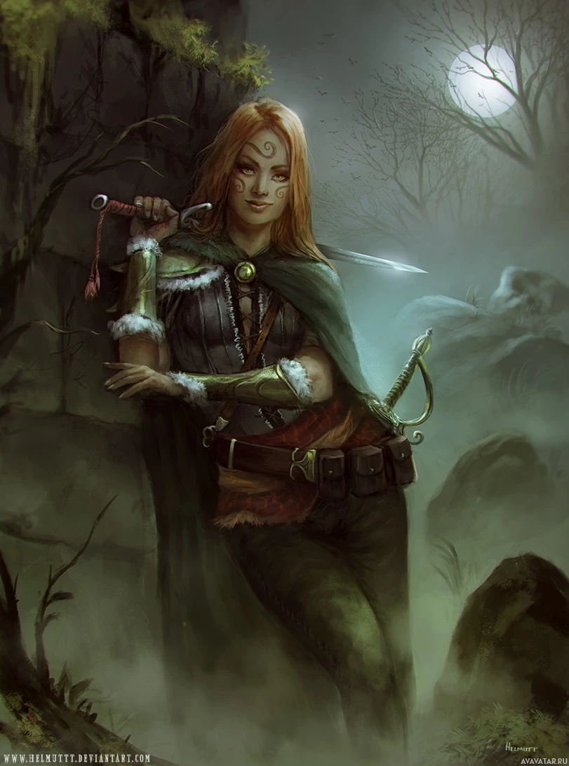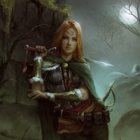 armor pieces and a cape with what looks like a fur trim around the hood, which adds to her fantasy or historical theme. The background suggests a forest or wilderness setting at night, as indicated by
