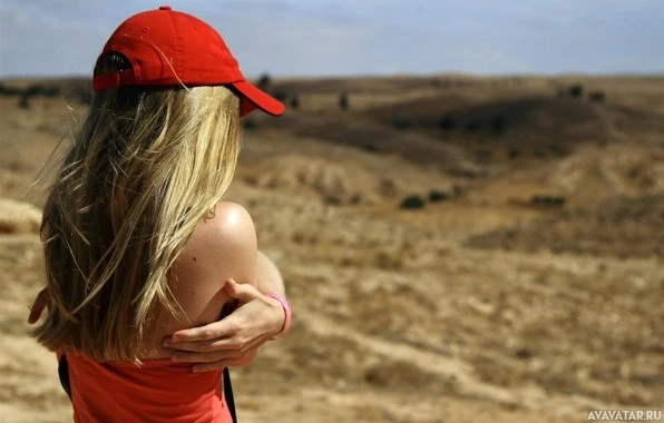 an outdoor environment, possibly a desert or arid landscape, given the clear skies and the flat terrain visible in the background. The woman is wearing casual