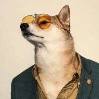 human clothing, including a suit jacket and sunglasses. The dog is standing on its