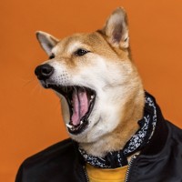 Shiba Inu breed, characterized by its fox-like facial features and thick fur. It is captured in mid-shake or yawn, showing its teeth, which gives an impression similar to