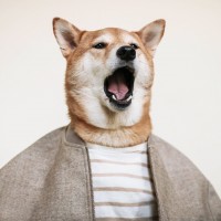 a Shiba Inu, a breed known for its distinctive facial features. The dog is wearing a jacket and has its mouth open as if it's barking or yawning. It is an anthropomorphic depiction of the dog, dressed in