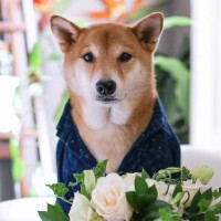 potted plants in the background. In front of the dog is a bouquet of flowers in a container, which could be part of