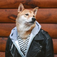The image shows a dog wearing a jacket and a pair of sunglasses. The dog is sitting upright, with its head turned to the side as if looking off into the distance. The background features wooden paneling that adds