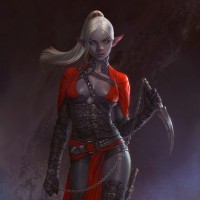 a female character that appears to be a drow, which is a fictional race of dark-skinned elves in the Dungeons & Dragons fantasy roleplaying game. She is wearing a red and black armor with chainmail sleeves, suggesting she might be from an adventurous background or